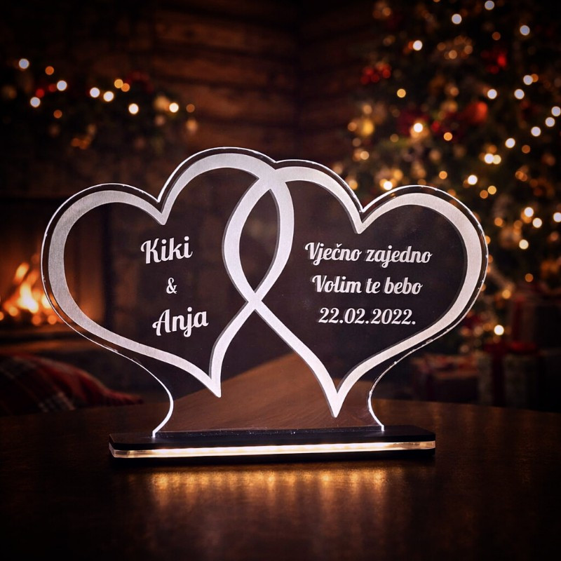 Personalizirana LED lampa dva srca s imenima i tekstom idealan je romantičan poklon za parove. Toplo svjetlo i osobna poruka stvaraju trajnu uspomenu za posebne trenutke.