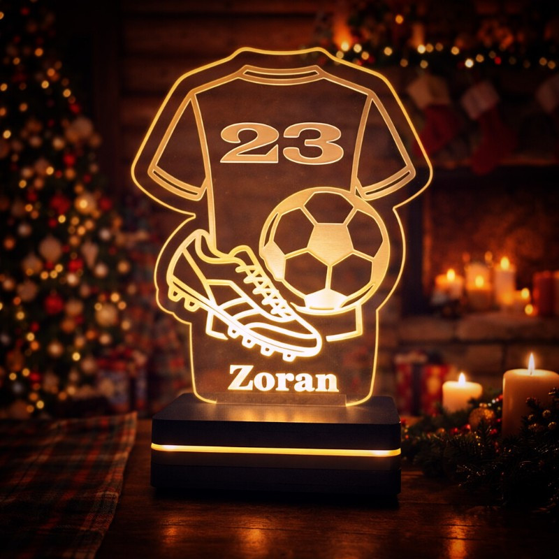 Personalizirana nogometna lampa s motivom dresa, kopački i lopte dekorativna je LED lampa namijenjena svim ljubiteljima nogometa. Izrađuje se po narudžbi i personalizira imenom, čime postaje jedinstven poklon koji ima osobno značenje. Motiv nogometa jasno govori kome je namijenjena, a nježno svjetlo čini je savršenom za dječju ili tinejdžersku sobu.