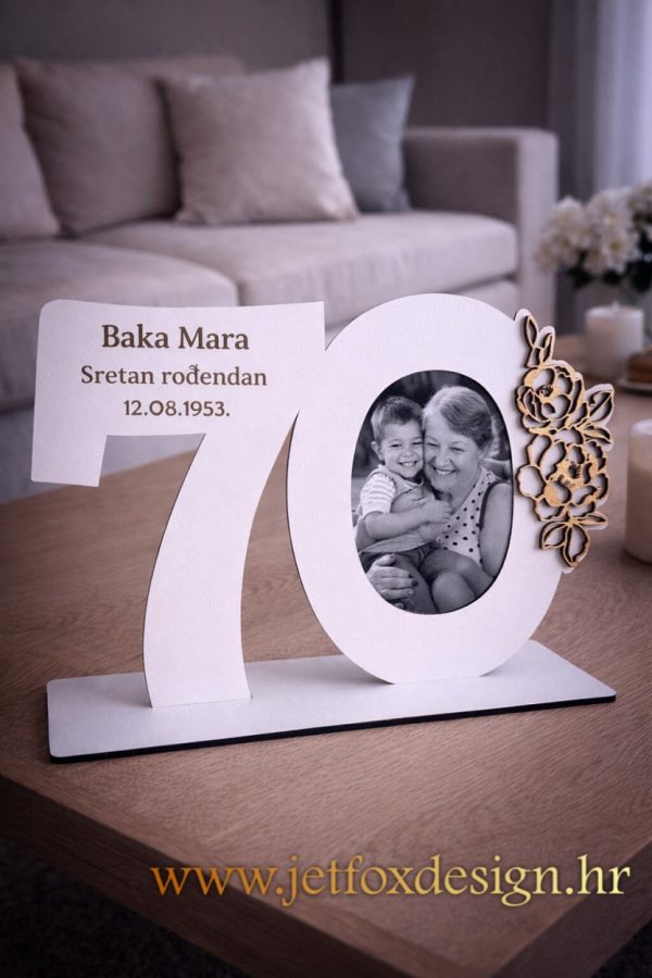 Dekoracija se sastoji od velikog broja koji označava godine ili važnu obljetnicu te okvira s fotografijom. Na broju se nalazi personalizirana poruka, datum i ime, dok fotografija dodatno naglašava emocionalnu vrijednost poklona. Cvjetni detalji daju joj nježan i profinjen izgled, zbog čega je posebno prikladna za žensku osobu – mamu, baku, suprugu ili curu.