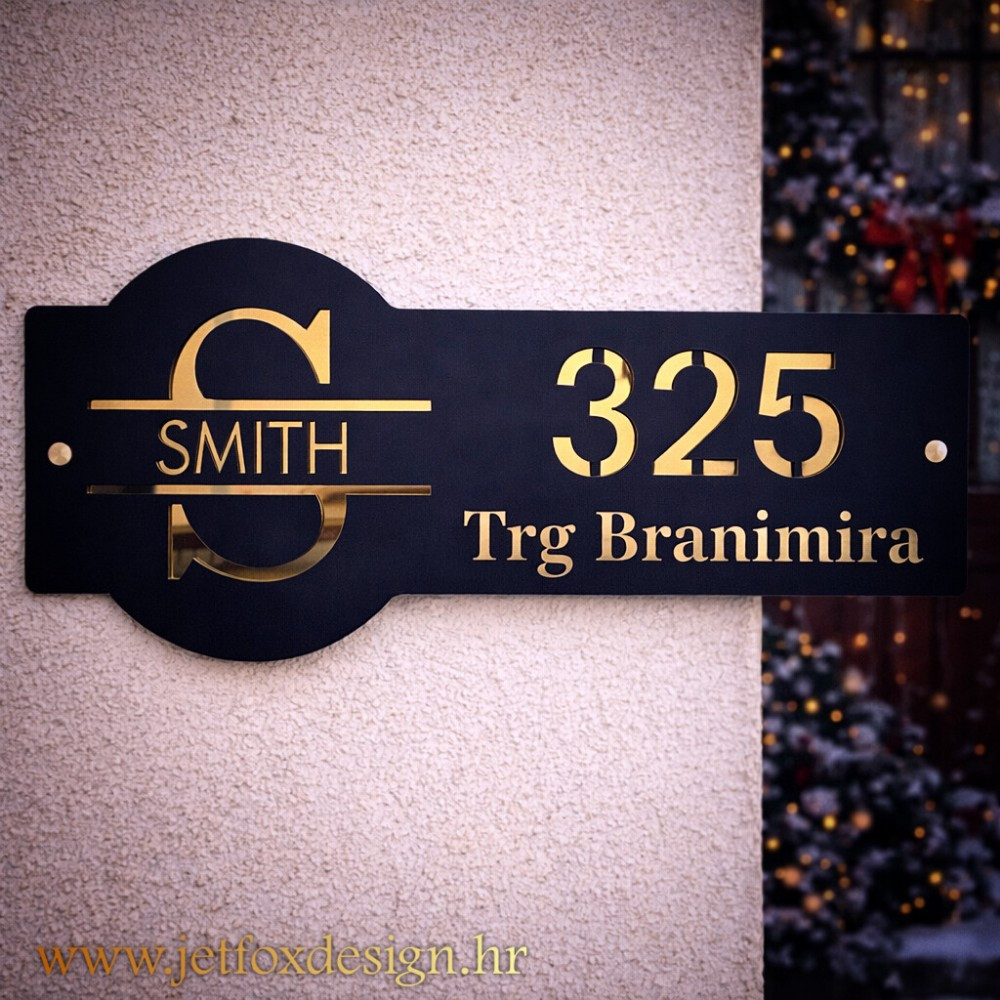 Personalizirani kućni broj s inicijalom u kružnom znaku namijenjen je vlasnicima domova koji žele snažan, ali odmjeren vizualni identitet već na ulazu. Glavni dizajnerski element je veliko početno slovo, smješteno unutar kružnog oblika, koje simbolizira obitelj, identitet i pripadnost. Ovakav raspored elemenata daje ploči luksuzan i arhitektonski dojam.