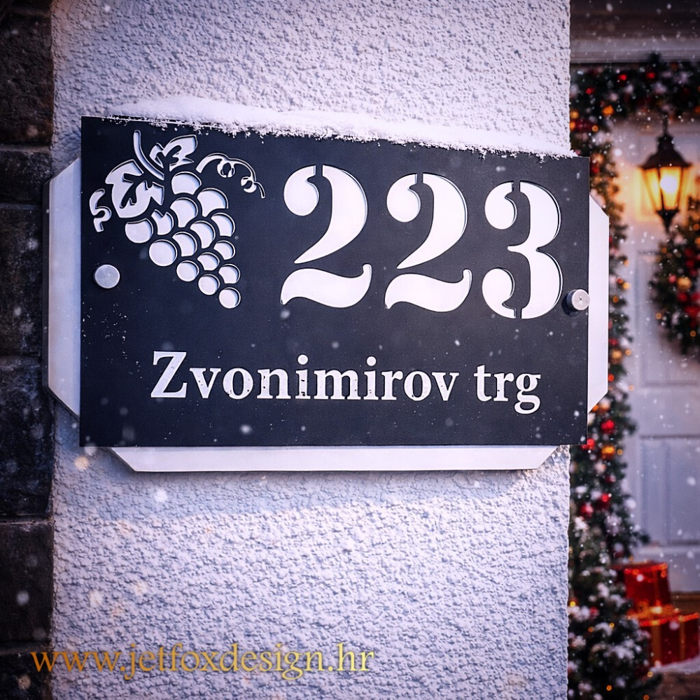 Motiv grozda diskretno je uklopljen u dizajn kućnog broja i daje mu prepoznatljiv izgled bez pretjerivanja. Upravo zato ovaj model često biraju oni koji žele nešto drugačije, ali i dalje elegantno i dugoročno primjenjivo.