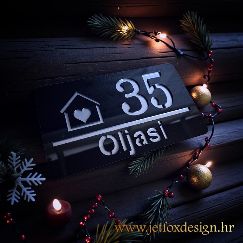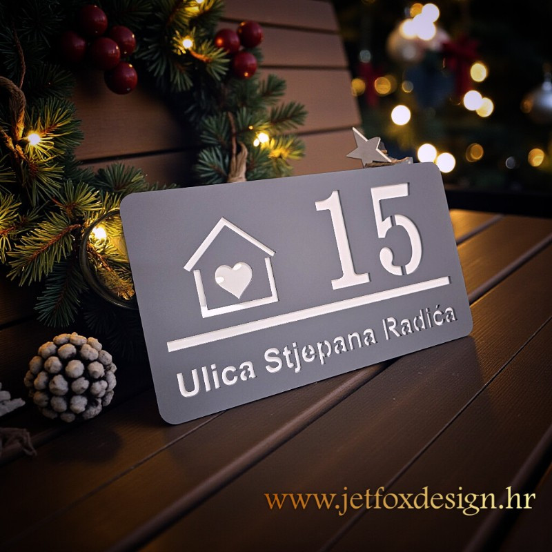 Kućni broj i tekst izrađuju se po želji kupca, dok motiv kućice sa srcem ostaje stalni dizajnerski element koji ovom kućnom broju daje prepoznatljiv i osoban karakter.