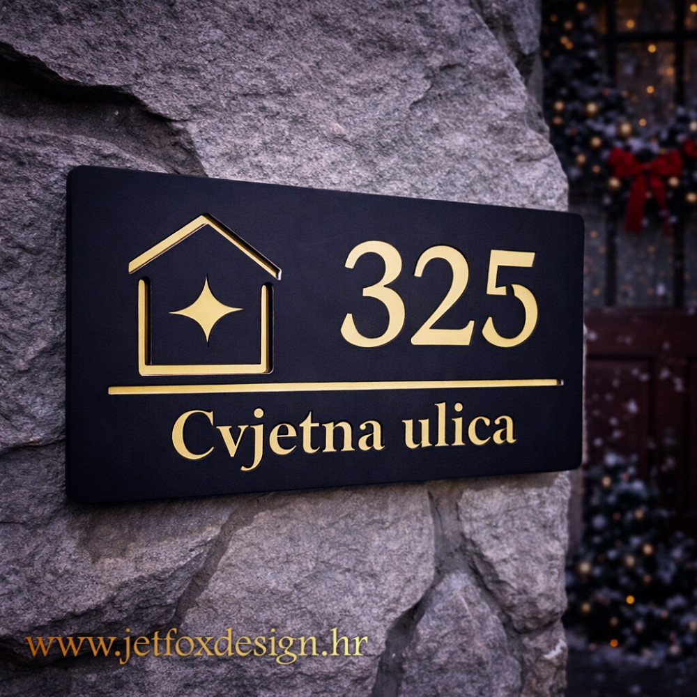 Kućni broj i naziv ulice izrađuju se po želji kupca, dok motiv kućice sa zvijezdom ostaje stalni dizajnerski element koji ovom kućnom broju daje prepoznatljiv karakter.