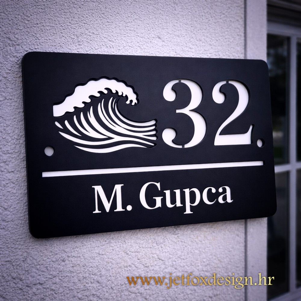 Tražiš detalj koji će se primijetiti na prvi pogled? Personalizirani kućni broj s motivom vala donosi spoj modernog dizajna, čiste linije i snažne simbolike. Motiv vala daje osjećaj kretanja, slobode i povezanosti s prirodom, dok kontrast crne podloge i svijetlih elemenata stvara izrazito elegantan i čitljiv izgled.