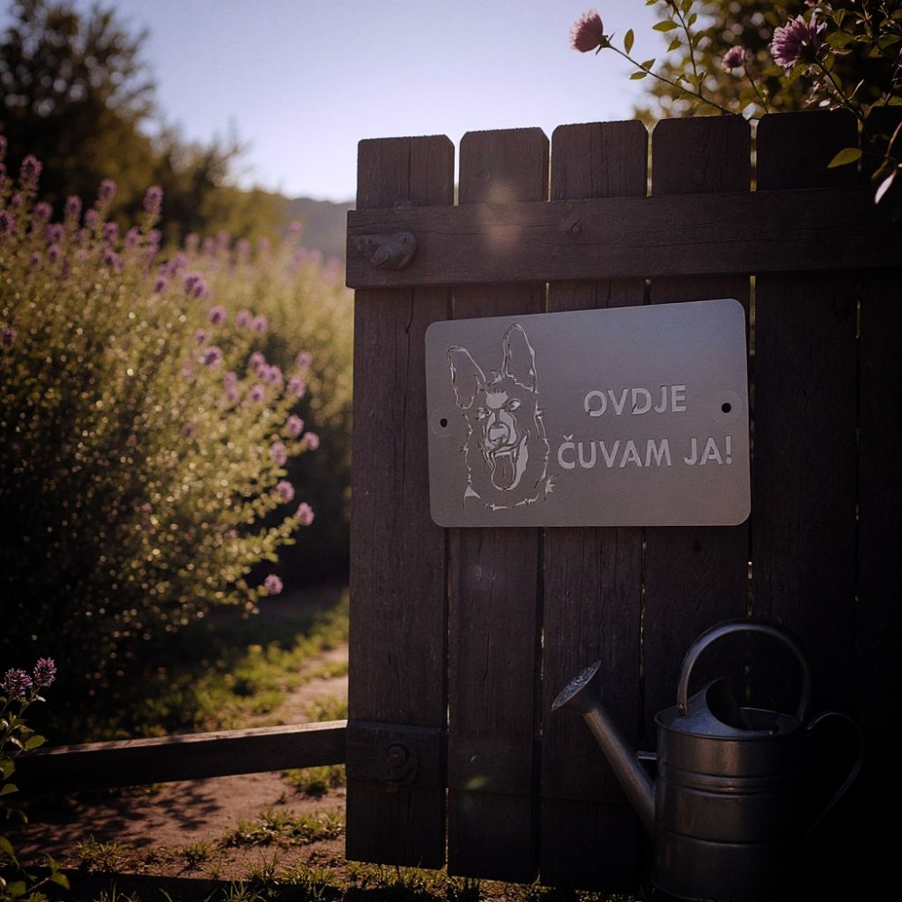 Tražite unikatan i upečatljiv natpis koji jasno daje do znanja da vaš dom ili imanje štiti pas? Ovaj personalizirani natpis “Ovdje čuvam ja” s motivom Dobermana idealan je za dvorišta, kapije, ulazna vrata i poslovne prostore.