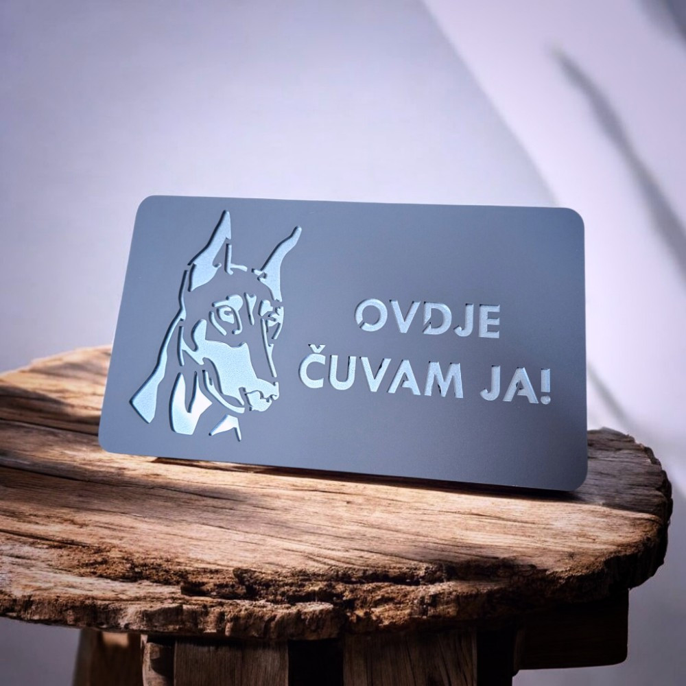 Tražite unikatan i upečatljiv natpis koji jasno daje do znanja da vaš dom ili imanje štiti pas? Ovaj personalizirani natpis “Ovdje čuvam ja” s motivom Dobermana idealan je za dvorišta, kapije, ulazna vrata i poslovne prostore.