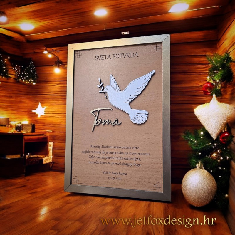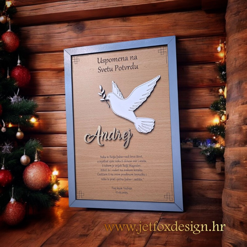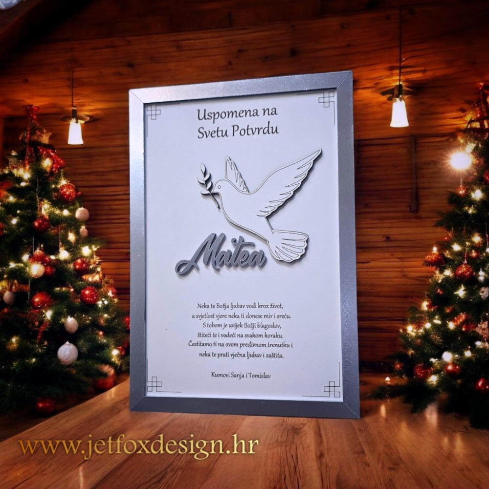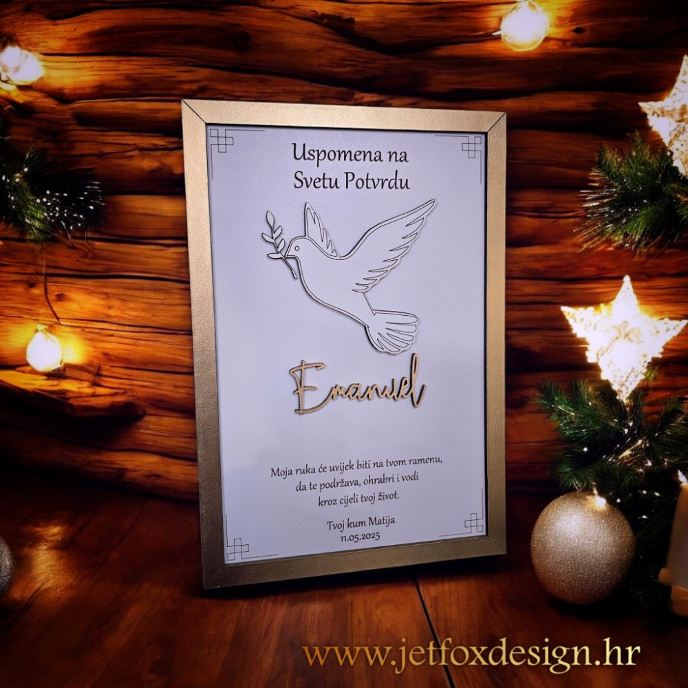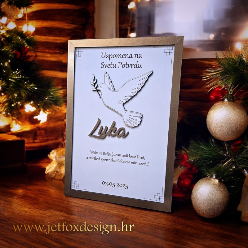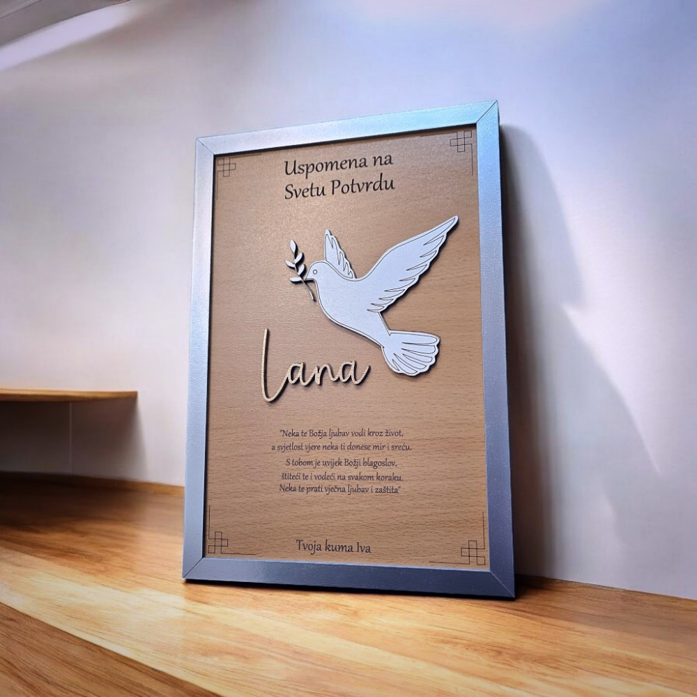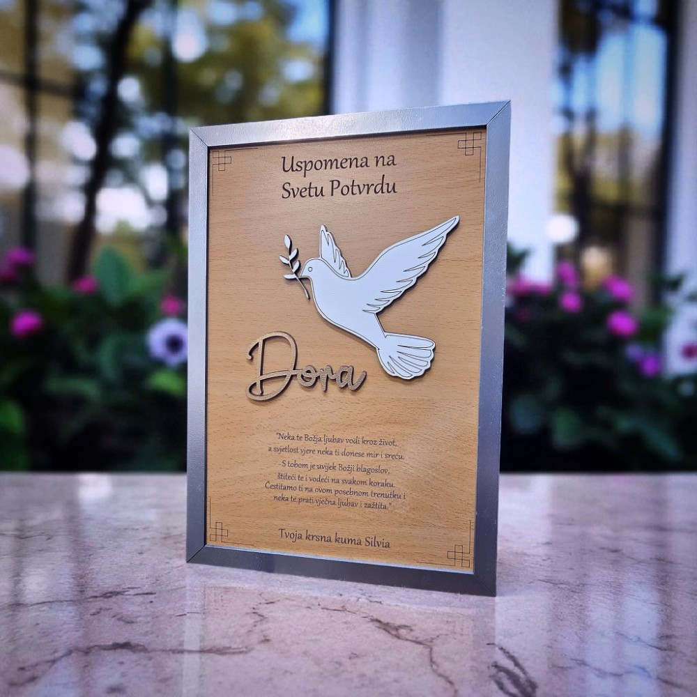 Personalizirani okvir uspomena s motivom golubice ili vlastitom fotografijom poseban je poklon koji čuva sjećanje na važne sakramente. Golubica simbolizira mir, vjeru i Duha Svetoga, dok opcija vlastite fotografije omogućuje još osobniji pristup. Okvir se personalizira imenom djeteta i posvetom, čime postaje trajna uspomena, a ne samo dekoracija.