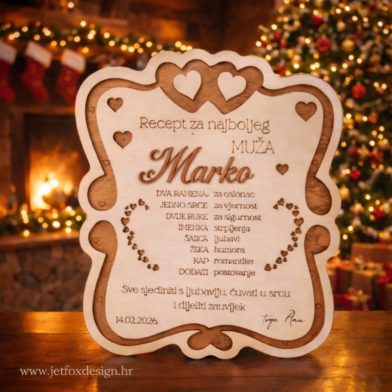 Personalizirani poklon „Recept za najboljeg muža“ kombinira humor i emociju u jednom drvenom ukrasu. Tekst u obliku recepta simbolično opisuje ljubav, strpljenje, podršku i poštovanje – sve ono što čini brak posebnim.