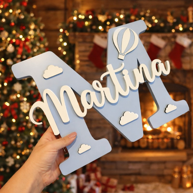 Personalizirano drveno slovo s imenom za dječju sobu unosi toplinu, nježnost i osobni pečat u prostor vašeg djeteta. Izrađeno je od kvalitetnog drveta, višeslojno, s reljefnim 3D imenom i dekorativnim motivima poput oblaka i balona na vrući zrak. Svako slovo prilagođava se imenu po želji, bojama i motivima.