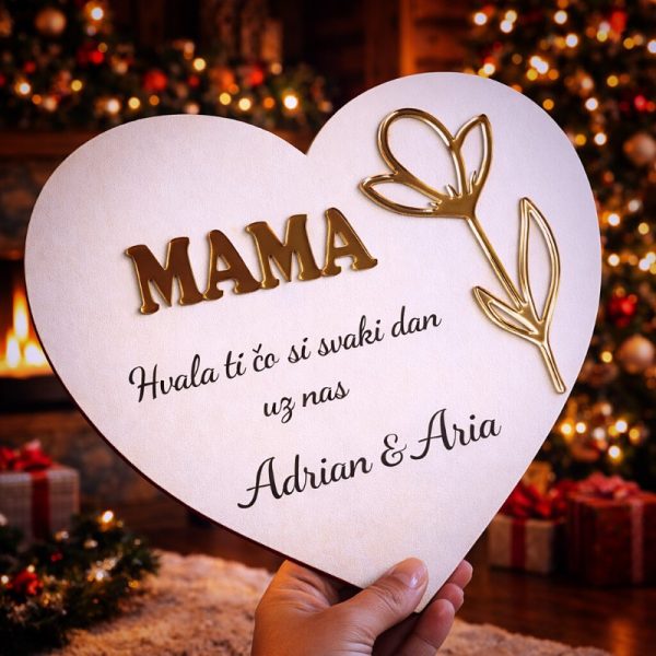 Personalizirano drveno srce za mamu s imenima djece emotivan je poklon koji prenosi zahvalnost, ljubav i poštovanje. Izrađeno je od kvalitetnog drveta, u obliku srca, s reljefnim zlatnim natpisom i nježnim dekorativnim motivom cvijeta. Imena djece i poruka prilagođavaju se prema vašoj želji.