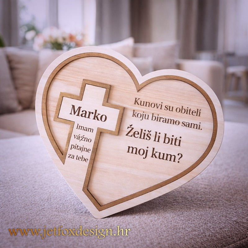 Pitalica za kumstvo u obliku srca s križem dostojanstven je i emotivan način da postaviš pitanje hoćeš li biti moj kum. Personalizirana imenom i tekstom, idealna je za krštenje, pričest i krizmu. Ako želiš trenutak koji se pamti, ovo je pravi izbor. Više ideja pronađi u vodiču kako pitati nekog da ti bude kum.