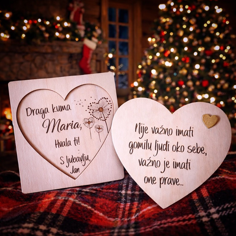 Pitalica za kumu u obliku srca s maslačkom i porukom Hoćeš li biti moja kuma nježan je i emotivan način postavljanja važnog pitanja. Personalizirana imenom i tekstom, savršena je za krštenje, pričest i krizmu. Ako želiš trenutak koji se pamti, ovo je pravi izbor. Više ideja pronađi u vodiču kako pitati nekog da ti bude kum.