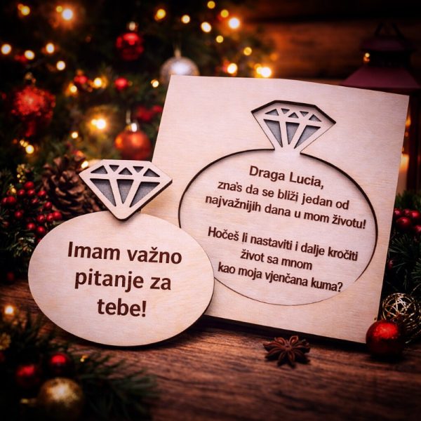 Kako postaviti pitanje koje će se pamtiti godinama? Tako da ga povežeš sa simbolom vjenčanja. Oblik prstena jasno povezuje kumstvo s brakom i zajedništvom, a personalizirani tekst daje osobnu notu.