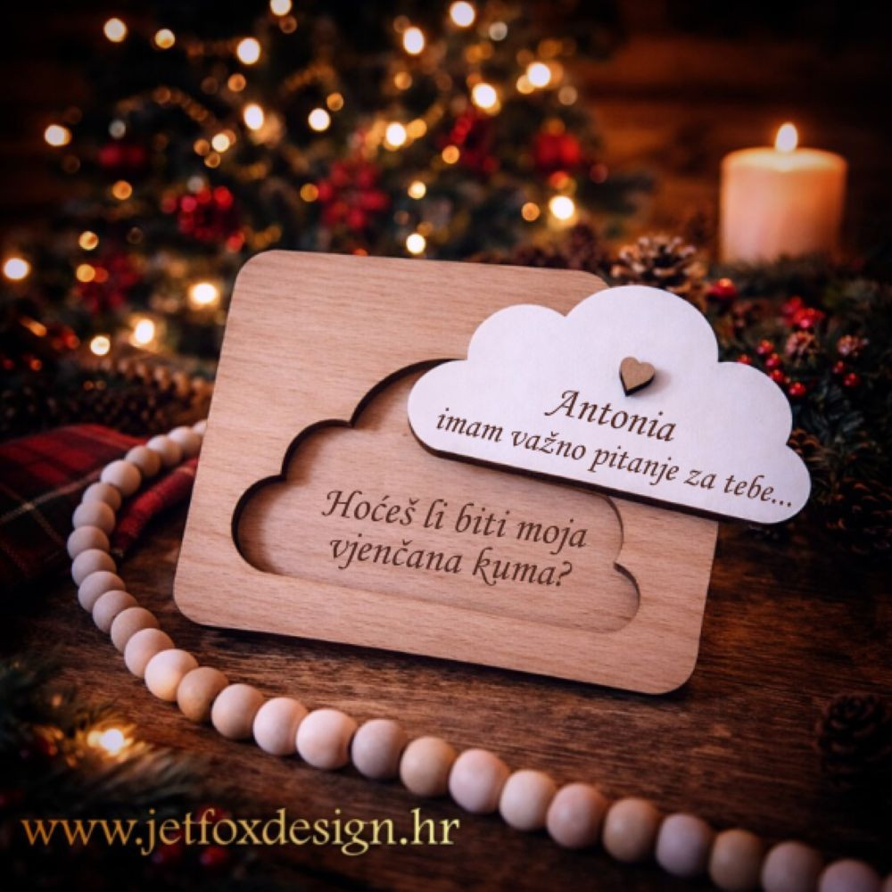 Pitanje za kumu u obliku drvene pitalice – oblaka osmišljeno je za trenutke kada želiš da pitanje bude nježno, toplo i iskreno. Oblik oblaka simbolizira mir, sigurnost i bezbrižnost, a često se povezuje s djetinjstvom, snovima i novim počecima. Upravo zato savršeno prati pitanje Hoćeš li biti moja kuma.