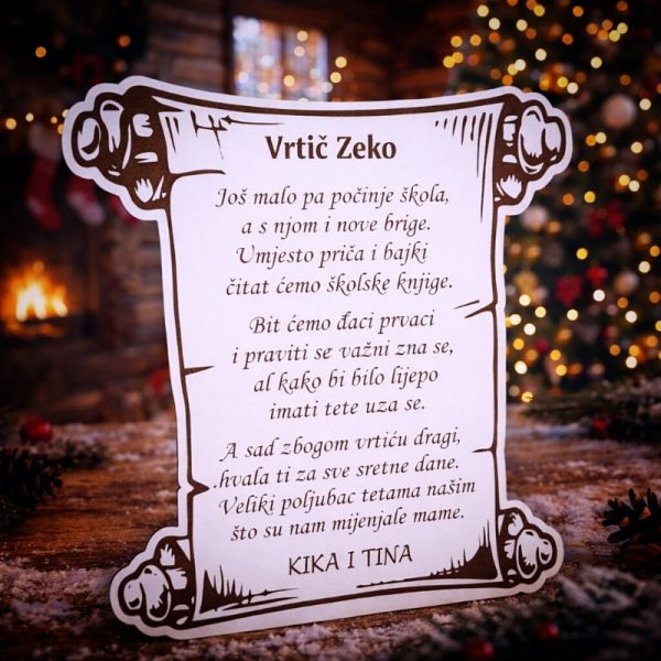 Personalizirani poklon za tete u vrtiću u obliku drvenog svitka savršen je način da se zahvali odgojiteljicama na ljubavi, strpljenju i brizi kroz sve vrtićke dane. Gravirani tekst zahvale, naziv vrtića i imena djece čine ovu dekoraciju jedinstvenom uspomenom.