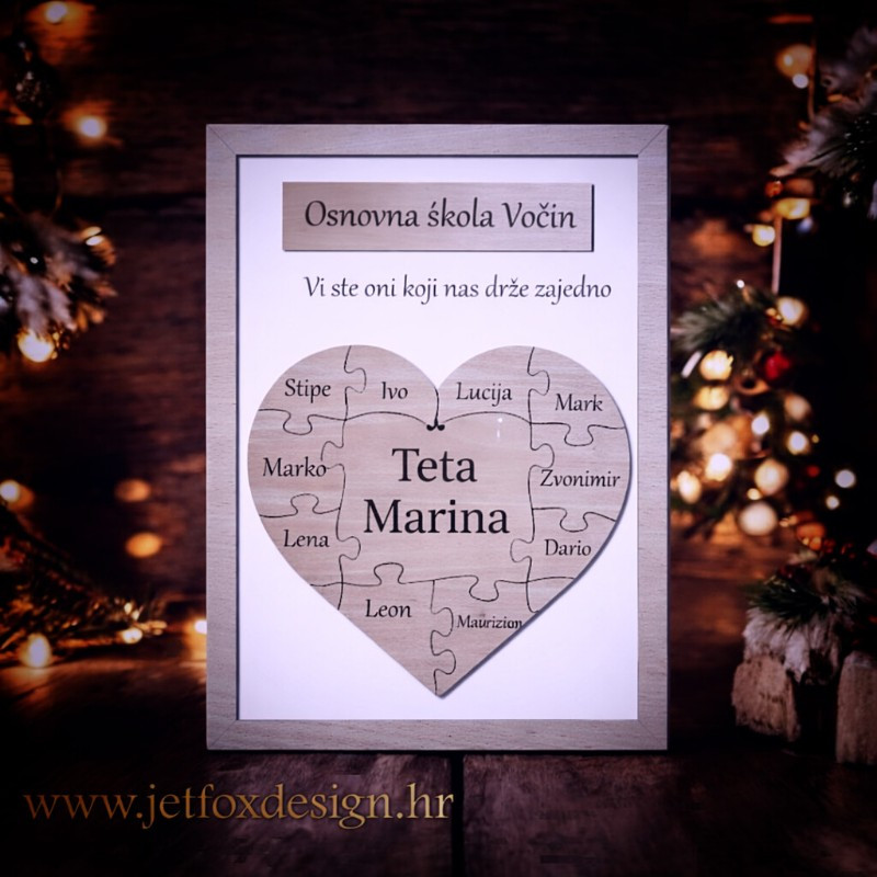 Ova drvena puzzle dekoracija simbolizira razred kao cjelinu. Svaki dio predstavlja jedno dijete, a zajedno čine skladnu sliku koja poručuje: zajedno smo rasli, učili i stvarali uspomene. Imena djece, ime učiteljice te personalizirani tekst čine ovu dekoraciju uistinu jedinstvenom.
