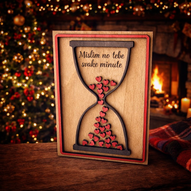 Romantična drvena dekoracija s motivom pješčanog sata i crvenim srcima simbolizira prolazak vremena – ali i činjenicu da prava ljubav traje. Natpis „Mislim na tebe svake minute“ jednostavan je, ali snažan način da pokažete koliko vam je netko važan.
