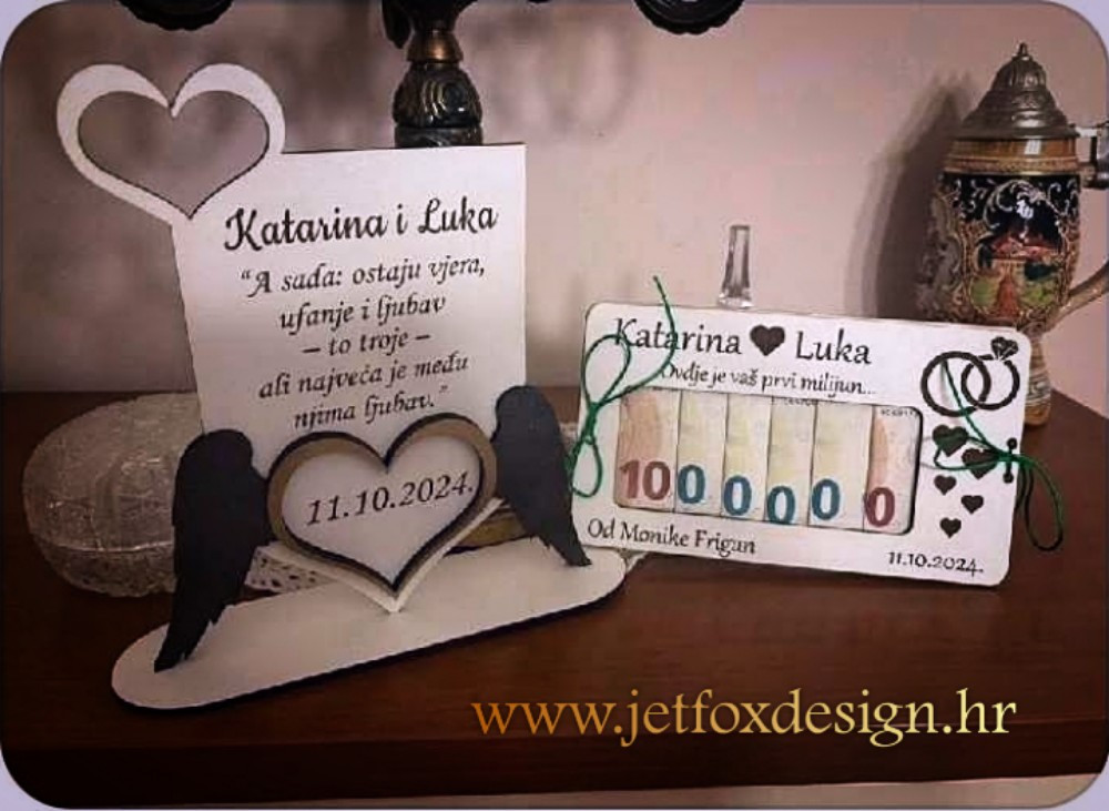 Stolna dekoracija za vjenčanje personalizira se imenima mladenaca i originalnom unikatnom posvetom, čime postaje uspomena s osobnom pričom. Idealan je poklon za vjenčanje od kumova, obitelji ili prijatelja, ali i kao dekoracija koja će krasiti dom mladenaca nakon svečanog dana. Kada se pitate što pokloniti mladencima, ovakav personalizirani dar nosi emociju i trajnu vrijednost. Tražite li poklon koji neće biti zaboravljen?