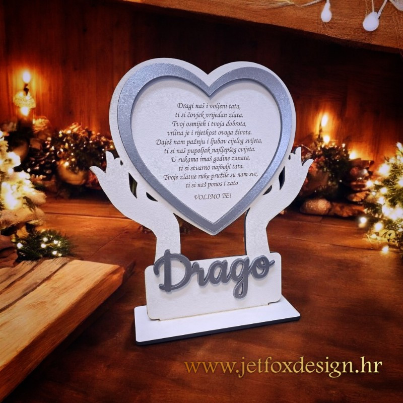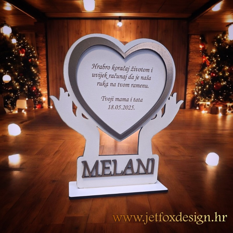Dekoracija je izrađena od visokokvalitetnog drveta i pažljivo gravirana kako bi svaki detalj bio savršen. Možete birati ime i posvetu, čime proizvod postaje još posebniji i prilagođen osobi kojoj ga poklanjate.