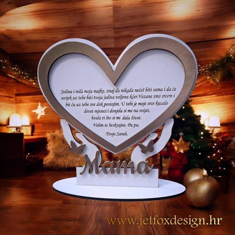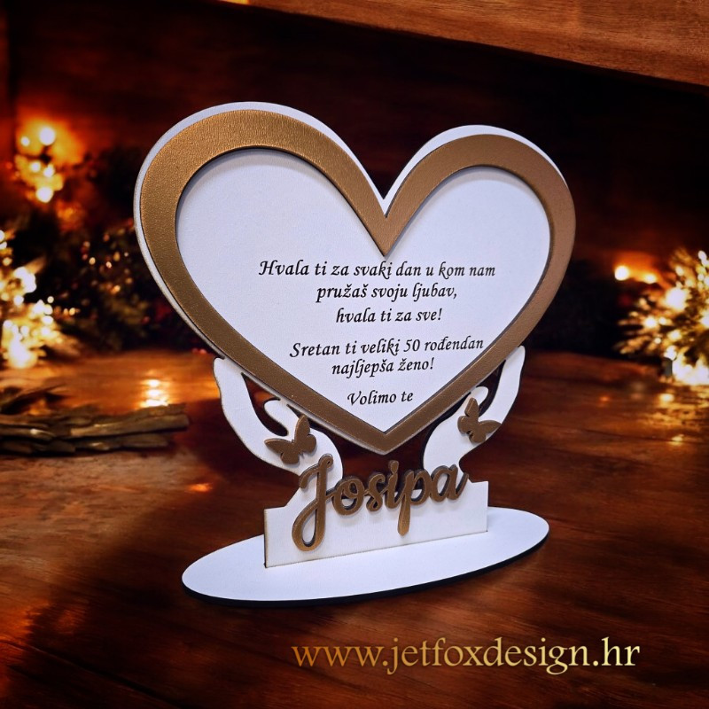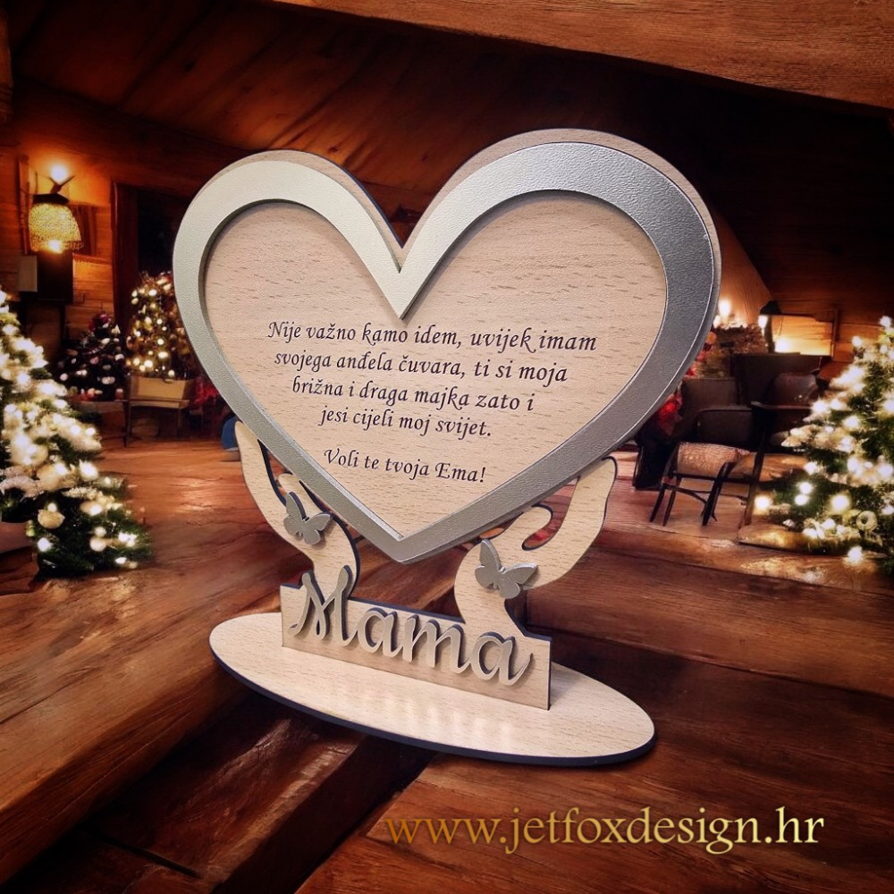 Tražite emotivan poklon koji će oduševiti voljenu osobu? Ova stolna dekoracija u obliku srca s imenom i posvetom po želji savršen je način da iskažete ljubav i zahvalnost. Unikatni dizajn i kvalitetna izrada od drveta čine ovaj ukras trajnom uspomenom.