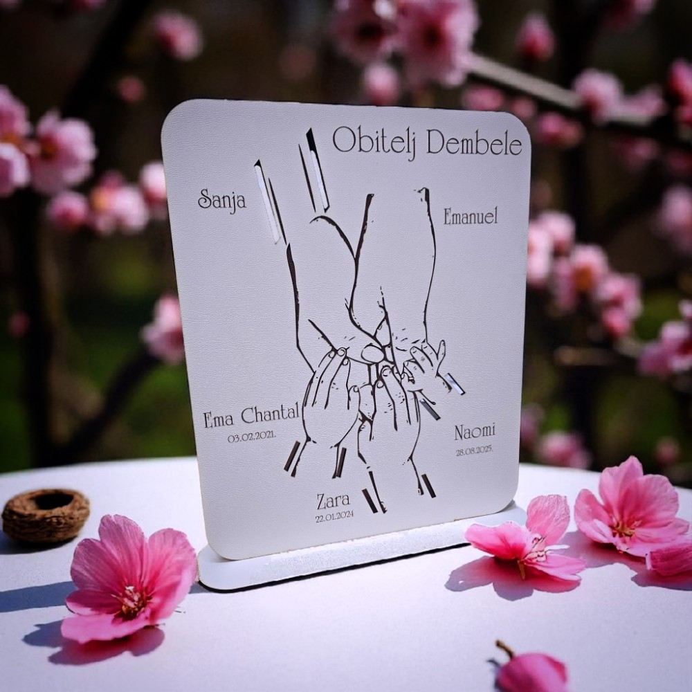 Postolje se personalizira imenima djece i imenom obitelji, čime postaje jedinstvena uspomena koja priča vašu obiteljsku priču. Prikladno je kao poklon za rođenje djeteta, baby shower ili kao dar roditeljima koji žele sačuvati uspomene na poseban način. Kada se pitate što pokloniti obitelji povodom rođenja bebe, ovakav personalizirani predmet ima posebnu težinu i značenje. Tražite li poklon koji nije prolazan?