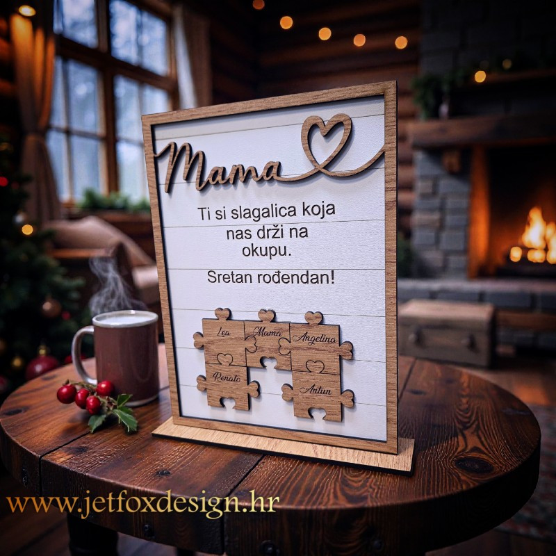 Slagalica kao motiv simbolizira obitelj, povezanost i ulogu mame kao središnjeg dijela svega. Drveni materijal daje toplinu i trajnost, a personalizirani tekst pretvara dekoraciju u uspomenu koja se ne zaboravlja. Ovo je poklon koji se ne sprema u ladicu, već svakodnevno ima svoje mjesto u domu. Ako tražiš još sličnih ideja, pogledaj personalizirane drvene dekoracije za dom, a više o važnosti ovakvih darova pročitaj u tekstu zašto darivati unikatno.