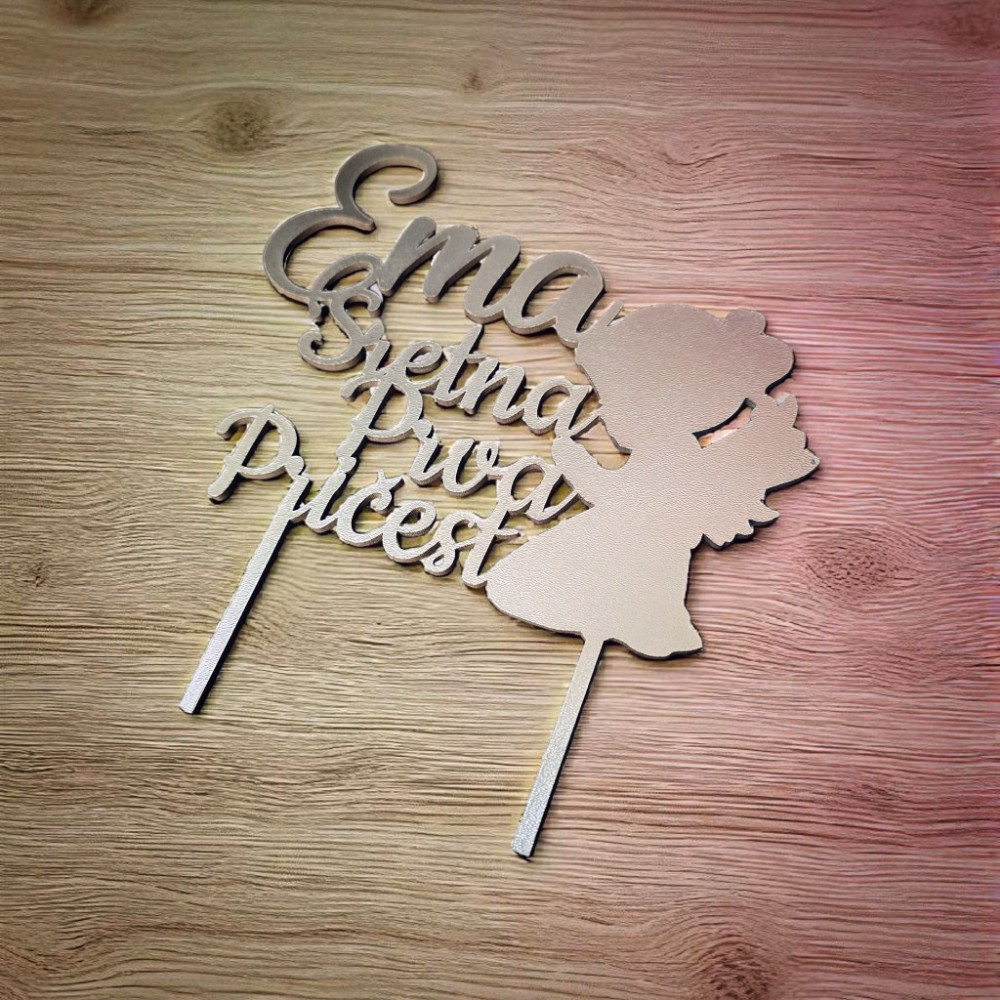 Personalizirani topper za Prvu pričest s imenom i motivom curice anđela osmišljen je kao nježan i dostojanstven ukras za tortu povodom Prve pričesti djevojčice. Motiv curice anđela simbolizira čistoću, vjeru i zaštitu, dok ime djeteta daje osobnu vrijednost i pretvara tortu u središnji detalj svečanog dana.