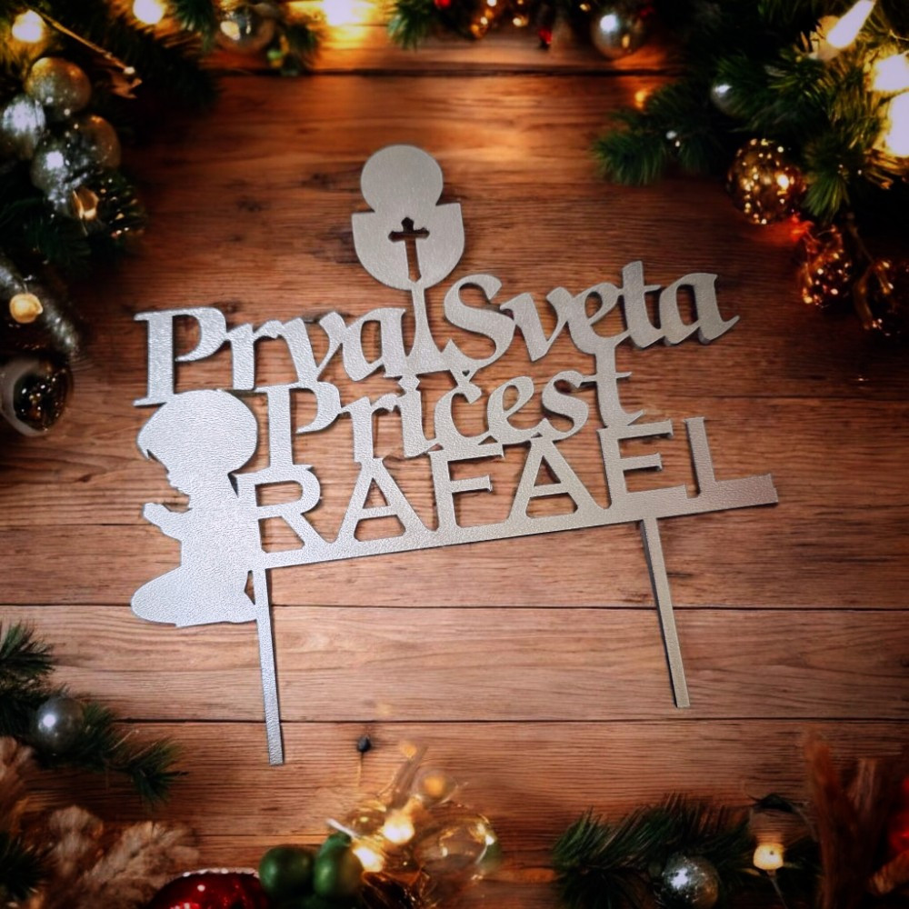 Personalizirani toper za Prvu svetu pričest s imenom, motivom dječaka koji moli i kaležom s hostijom osmišljen je kao svečan i luksuzan ukras za tortu povodom jednog od najvažnijih sakramenata. Natpis Prva sveta pričest jasno ističe prigodu, dok motivi dječaka u molitvi i kaleža s hostijom nose snažnu poruku vjere, poštovanja i duhovne zrelosti.