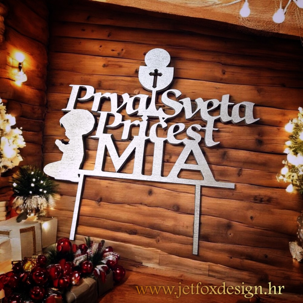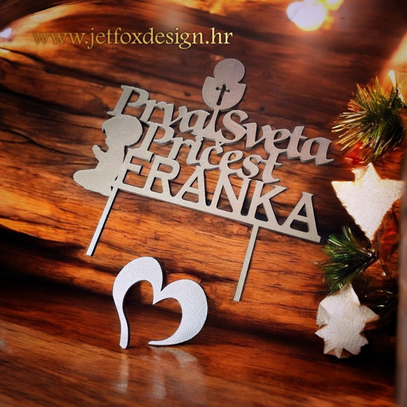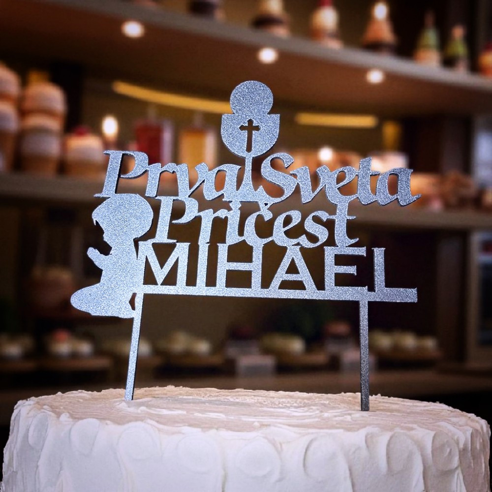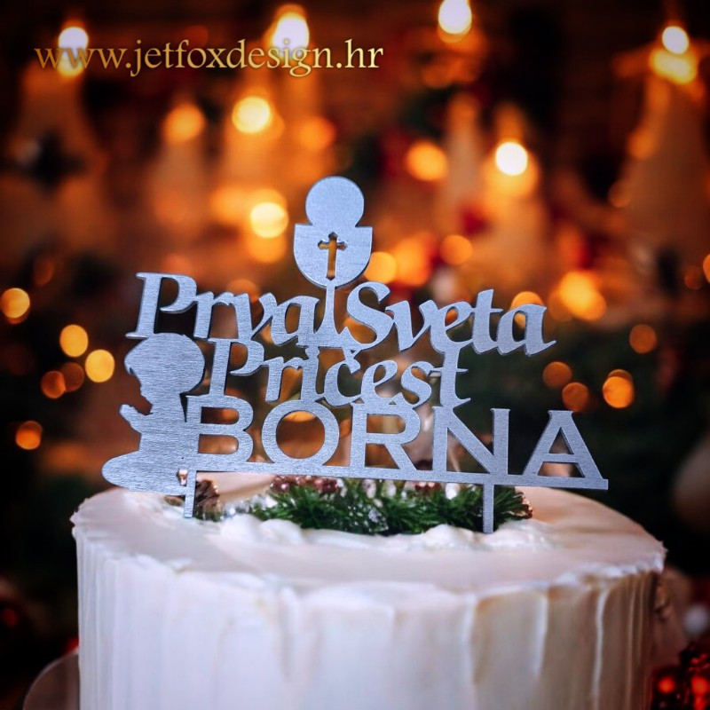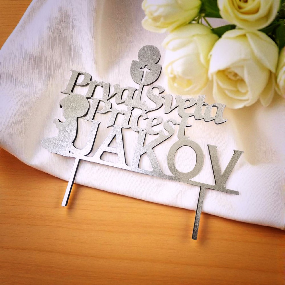 Ovaj toper vrh za tortu izrađuje se u zlatnoj, srebrnoj ili drugim luksuznim bojama po želji, što omogućuje savršeno uklapanje uz elegantne i klasične pričesne torte. Namijenjen je roditeljima, kumovima i obitelji koji žele dostojanstvenu dekoraciju s jasnim značenjem. Pitate se kako tortu za Prvu svetu pričest učiniti posebnijom bez pretjeranih ukrasa? Upravo ovakav toper daje ravnotežu između simbolike i elegancije.