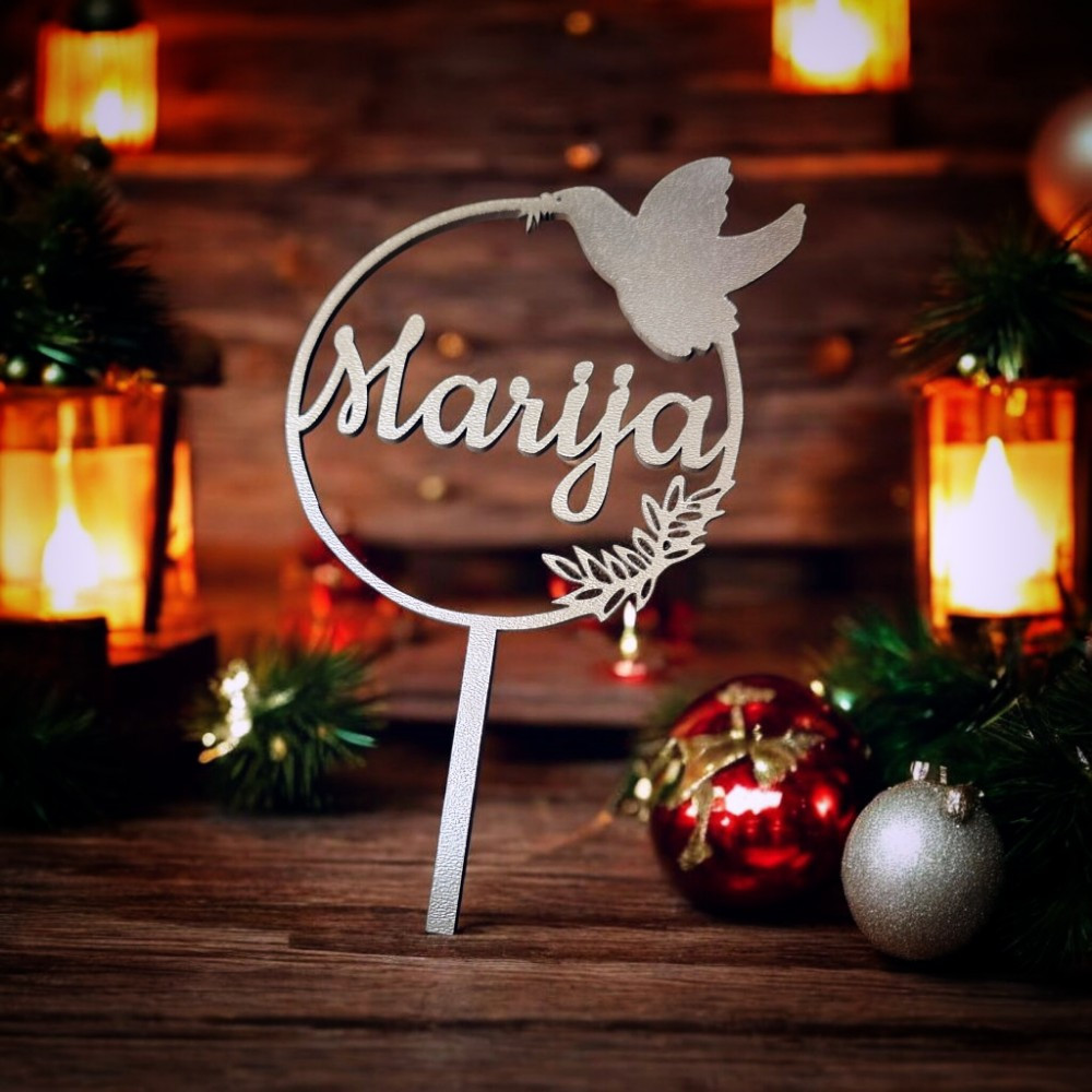 Personalizirani toper za tortu s golubicom u vijencu i imenom osmišljen je kao univerzalna i simbolična dekoracija za krštenje, Prvu pričest i Svetu potvrdu. Motiv golubice predstavlja Duha Svetoga, mir i čistoću, dok vijenac simbolizira zaštitu i zajedništvo. Ime po želji daje torti osobnu notu i čini je središnjim detaljem svečanog stola.
