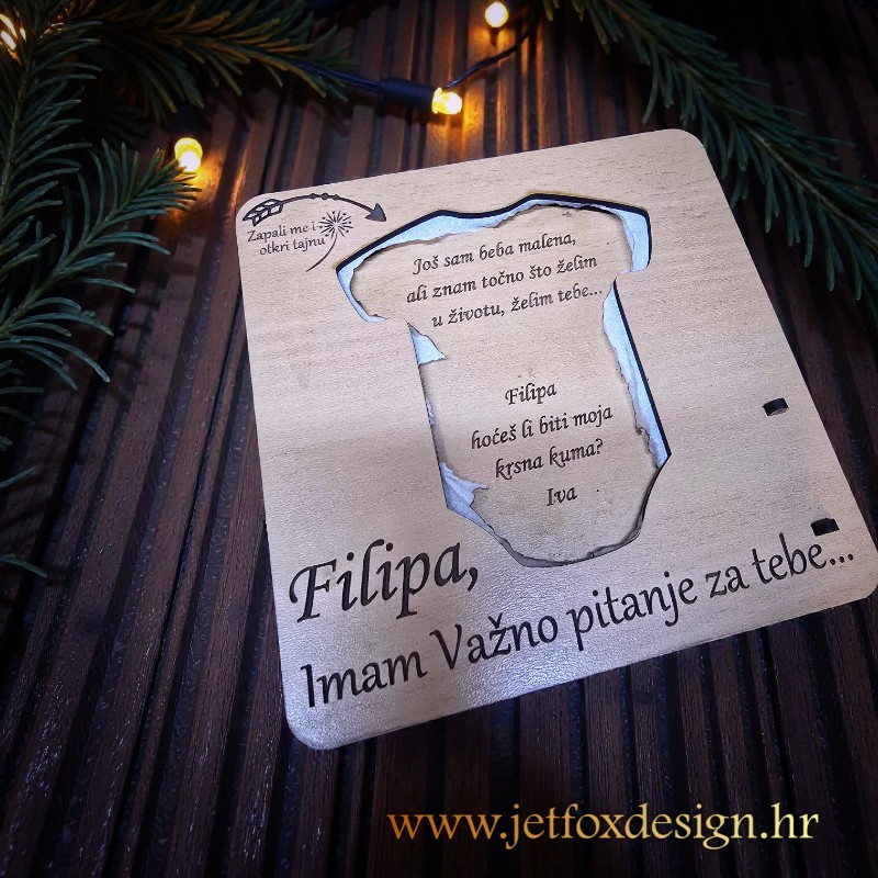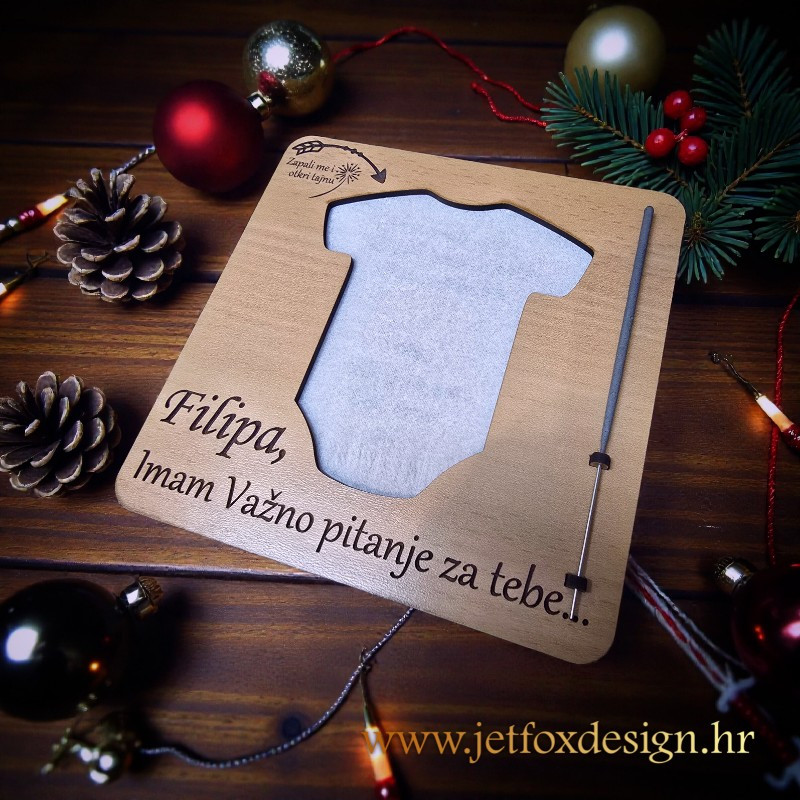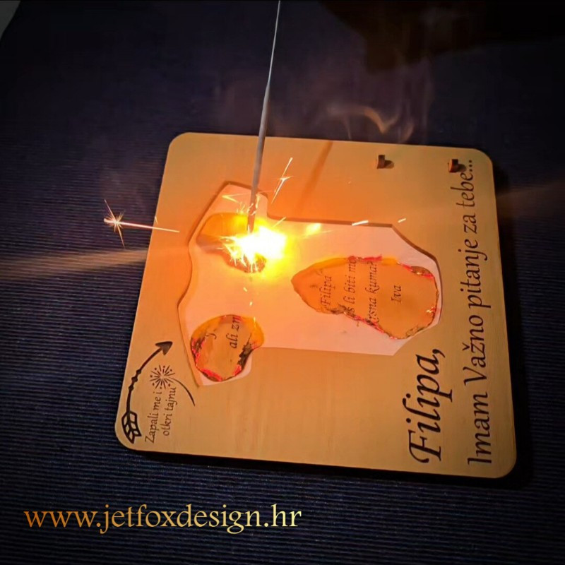 Zapaljiva vatrena pitalica u obliku dječjeg bodija osmišljena je za najnježnije i najemotivnije trenutke. Ova posebna pitalica koristi papir namijenjen kontroliranom sagorijevanju, a kako papir gori, postupno se otkriva skrivena poruka i fotografija. Upravo taj trenutak iznenađenja pretvara jednostavno pitanje u snažan emotivan doživljaj.