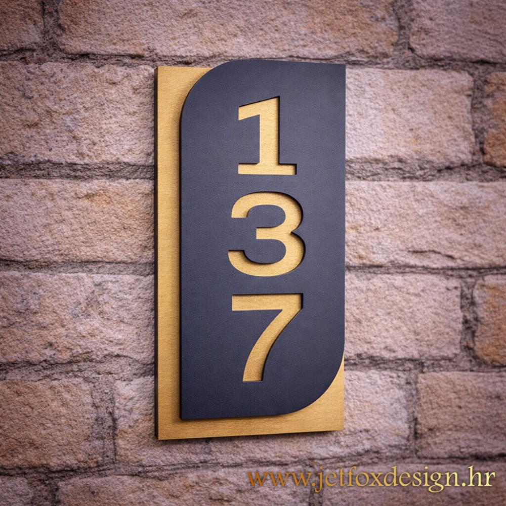 Vertikalni personalizirani kućni broj ističe se modernim rasporedom i elegantno zaobljenim oblikom koji daje suvremen izgled svakom ulazu. Dizajn je slojevit, s jasnim kontrastom boja koji naglašava broj i čini ga lako uočljivim već iz daljine. Broj se izrađuje po želji kupca, dok sam oblik i stil ostaju prepoznatljiv dio dizajna.