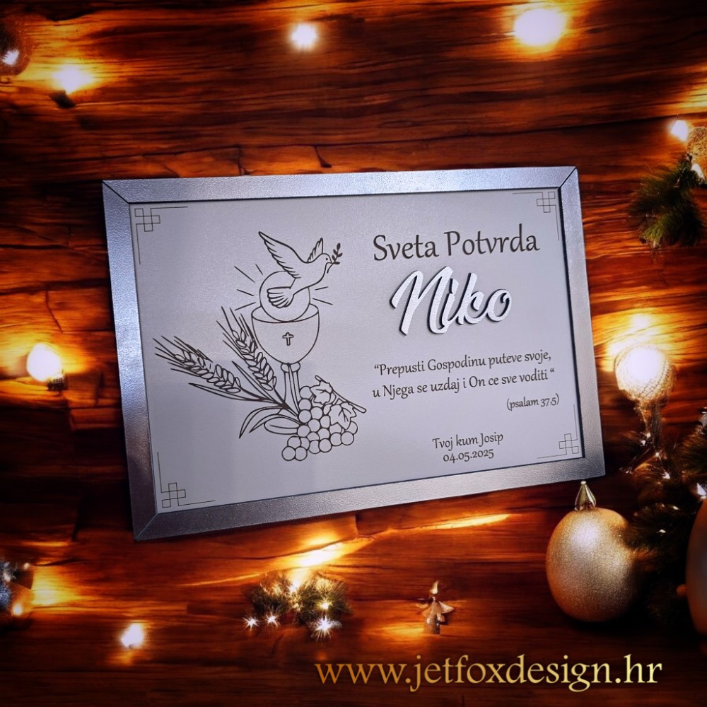 Personalizirana zahvalnica za svetu potvrdu od kuma, s imenom i posvetom, sadrži i psalm koji donosi mir i duhovnu snagu. Savršen poklon koji simbolizira ljubav, podršku i duhovnu povezanost, zahvalnica od kuma stvara trajnu uspomenu na ovaj važan trenutak u životu osobe koja prima svetu potvrdu. Uz osobnu posvetu, ova zahvalnica s psalmom pruža snagu i blagoslov za dalje duhovno putovanje. Idealna za kumove koji žele izraziti svoju podršku i ljubav prema mladoj osobi koja je primila sakrament svete potvrde. Ovaj poklon bit će dragocjena uspomena na važan trenutak vjere, ljubavi i zajedništva.