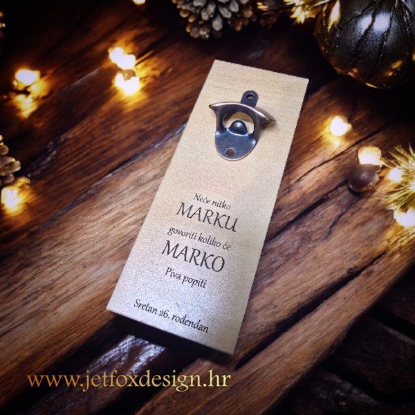 Drvena podloga s ugraviranim imenom, porukom ili čak fotografijom daje ovom otvaraču osobni pečat. Svaki primjerak priča svoju priču — bilo da se radi o kućnom baru, garaži, vikendici ili prostoru za okupljanje prijatelja.